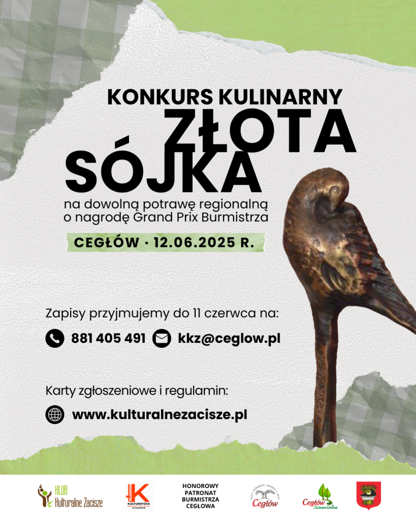 Smakosze, pasjonaci kuchni i lokalne gospodynie – zapraszamy Was do udziału w kolejnej edycji Konkursu Kulinarnego „Złota Sójka” na najlepszą potrawę regionalną! Konkurs organizowany jest w ramach XVII Festiwalu Folkloru i Smaku „Sójka Mazowiecka” – Piknik w miasteczku Cegłów.