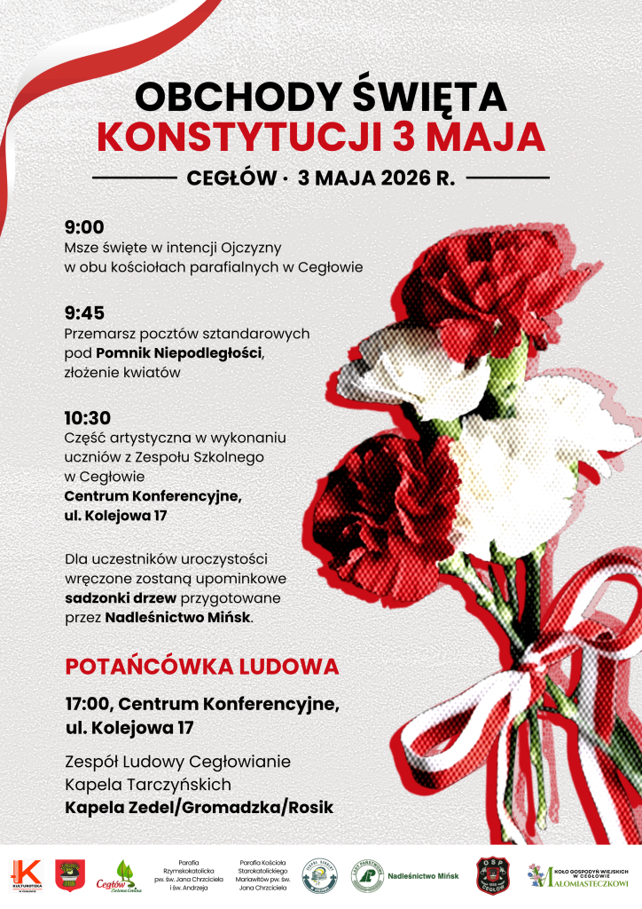Serdecznie zapraszamy mieszkańców oraz gości do udziału w obchodach Święta Konstytucji 3 Maja, które odbędą się w Cegłowie.