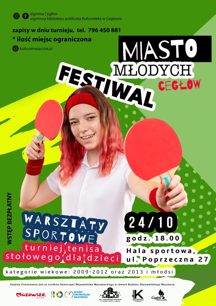 W ramach projektu Festiwal Miasto Młodych, realizowanego w Cegłowie ze środków Budżetu Obywatelskiego Mazowsza, zapraszamy na kolejne wydarzenie sportowe – turniej tenisa stołowego dla dzieci i młodzieży.
